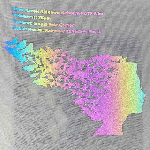 Reflective colorful DTF film is a hybrid cold peel. This is a solution so versatile that gives you bright colors and is premium coated. You and your customers will be amazed and happy. When you use the light to shine on this transferred DTF film.